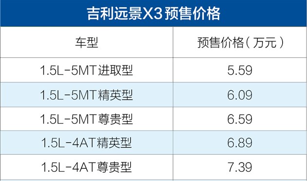 4、吉利遠景X3的報價可能會因政策、市場供求等因素而變動,請以實時信息為準。